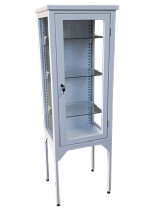Porta, laterais e prateleiras de vidro Temperado de 5mm e 03 prateleiras com regulagem de altura, pés com regulagem de nível.