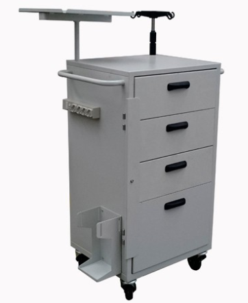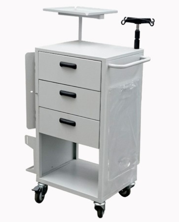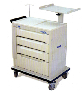 ButtonCARRO DE EMERGÊNCIA – MODELO CP-1000, marca Ecafix construído em chapa metálica, com tratamento antiferrugem e pintura eletrostática texturizada, com 04 rodízios de movimento de 360 graus e freio em 02 rodas. Gaveteiro composto de 03 gavetas, sendo uma com 18 divisões para guardar medicamentos e duas para instrumentos. Um compartimento fechado com tampa basculante, para uso geral. Tampo superior em material sintético dividido em dois módulos.
