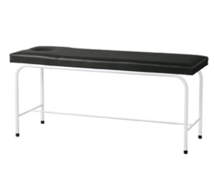 ButtonDivã para exames clínicos e fisioterapia, construído em tubos pintados de 1 1/4” x 1,06mm de espessura, trava em “H” em tubos pintados de 5/8” x 0,9mm de espessura. Leito estofado em espuma D23 revestido em curvim lavável. Cabeceira regulável através de cremalheiras, com orifício para o rosto.